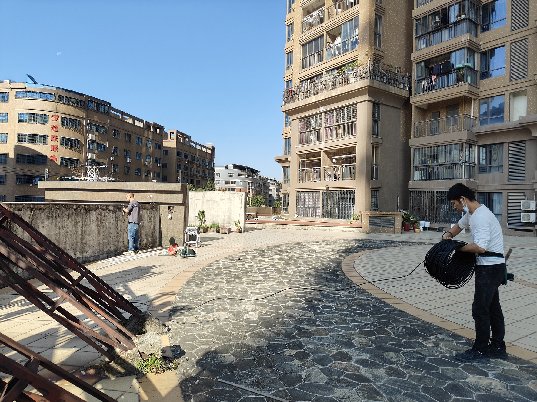 技術人員在布設高空拋物視頻設施